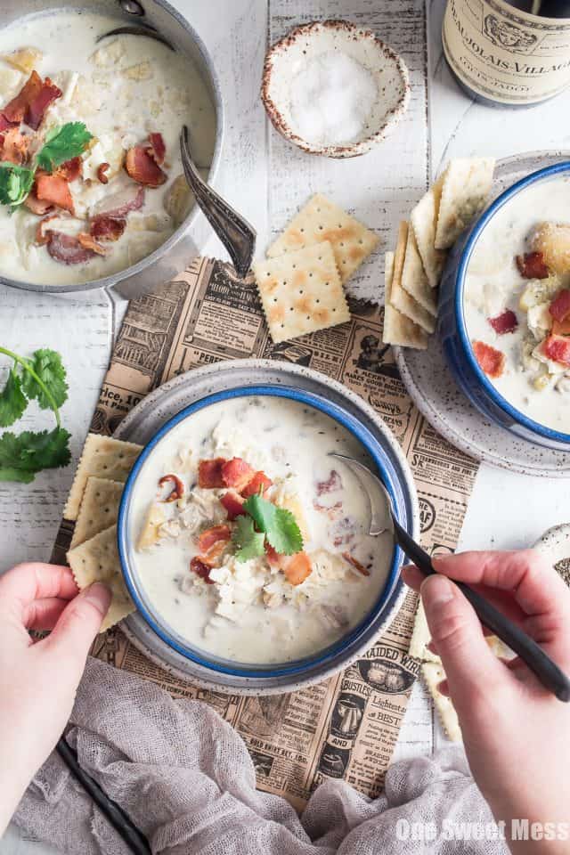 Not only is my recipe for gluten free new england clam chowder easy to make, but i also teach you how to make these cute bacon wrapped edible potato bowls! 4 slices bacon 1/2 large onion, chopped (about 1 cup) 4 cups diced potatoes 1 (8 oz.) bottle of clam juice 1 tsp salt 1/4 tsp pepper 2 (6 oz.) cans of clams (one can minced clams, one can whole clams) 3 tbsp brown rice flour* (or 1 1/2 tbsp. A low carb, keto clam chowder without all the dairy! This delicious clam chowder recipe is both easy and gluten free! It's dairy and grain free, but every bit as delicious as classic new england or rhode island.